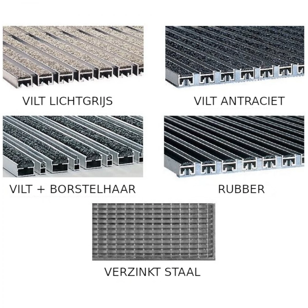 - Aluminium draagprofiel met reinigbare vilten strips in combinatie met borstelhaar in het antraciet