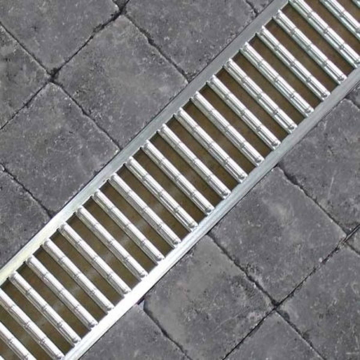 ACO Euroline 100 met galva rooster met uitloop voor efficiënte afwatering op plaatsen. Ideaal om in stijlvolle opritten te verwerken.