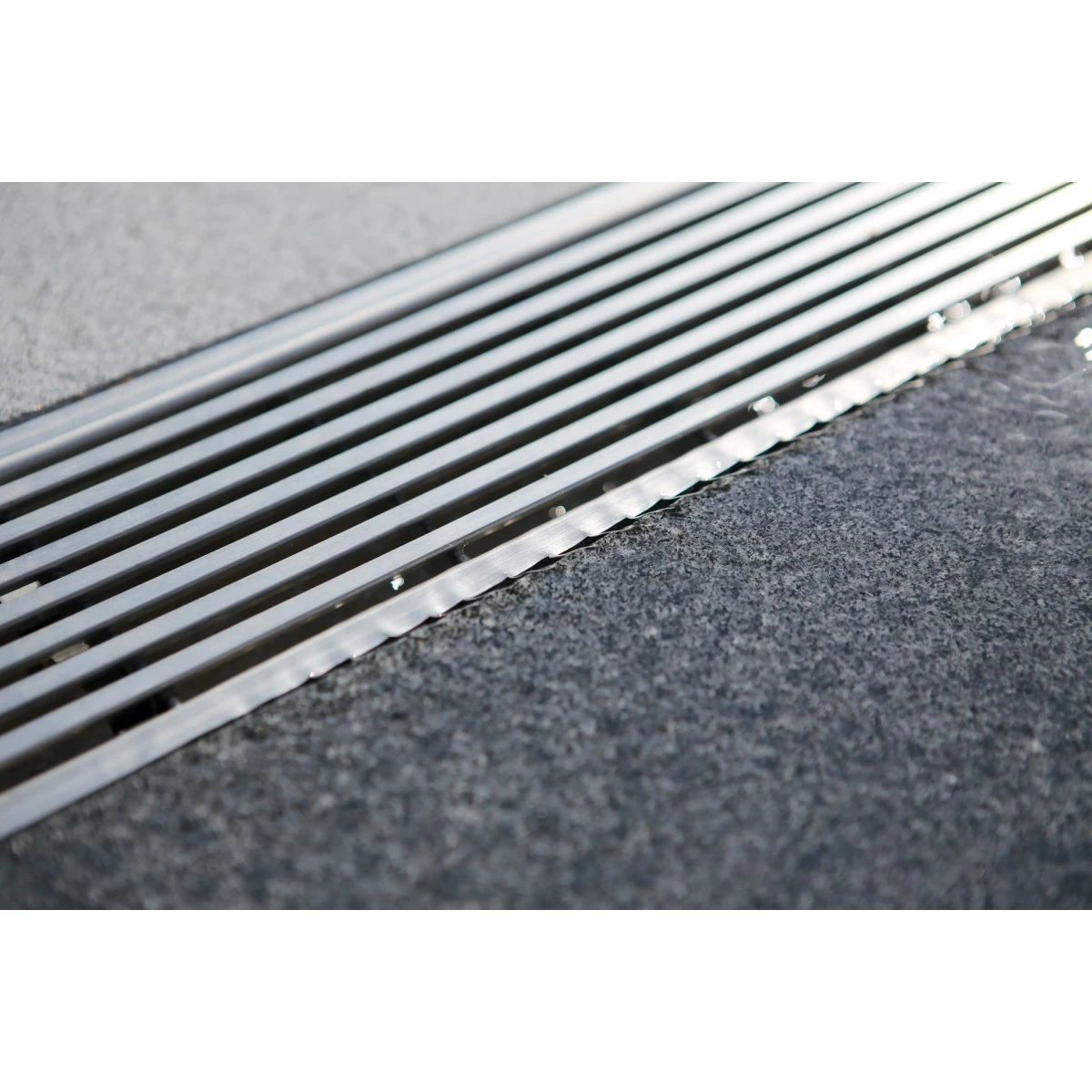 ACO Euroline 100 Inox is een afvoergoot uit polyesterbeton met perfect vrije doorlaat dankzij het schroefloos verankerd, esthetisch lengtestaafrooster uit inox, klasse A15kN