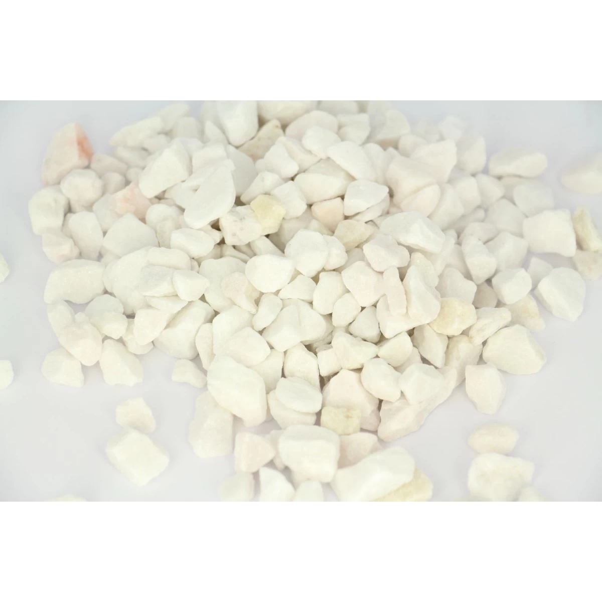 Opmerkingen: geschikt voor decoratieve en prefab betonsoorten, niet voor wegenbouw. Perfect te gebruiken in afboording en landschapselementen, tuin en park. Bijna perfect witte natuurlijke split met kleine blinkertjes in de zon. Exclusieve witte marmer, witter dan Carrara split.