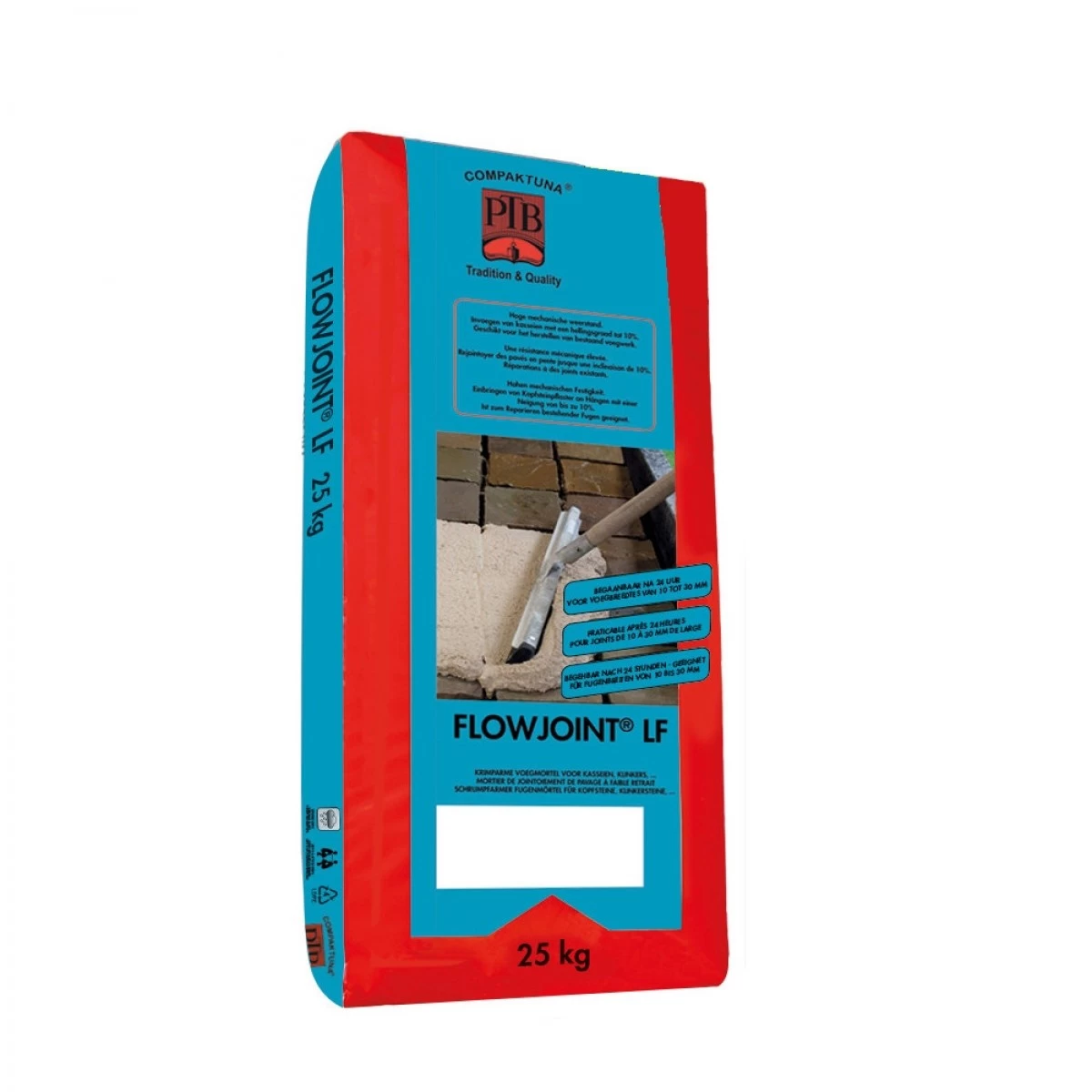 Compaktuna Flowjoint LF is een gebruiksklare krimparme voegmortel, dit wordt gebruikt voor het opvoegen van kasseien, niet poreuze klinkers, blauwe hardsteen en bestratingen waar een vroegtijdige belasting en ingebruikname gewenst wordt.
