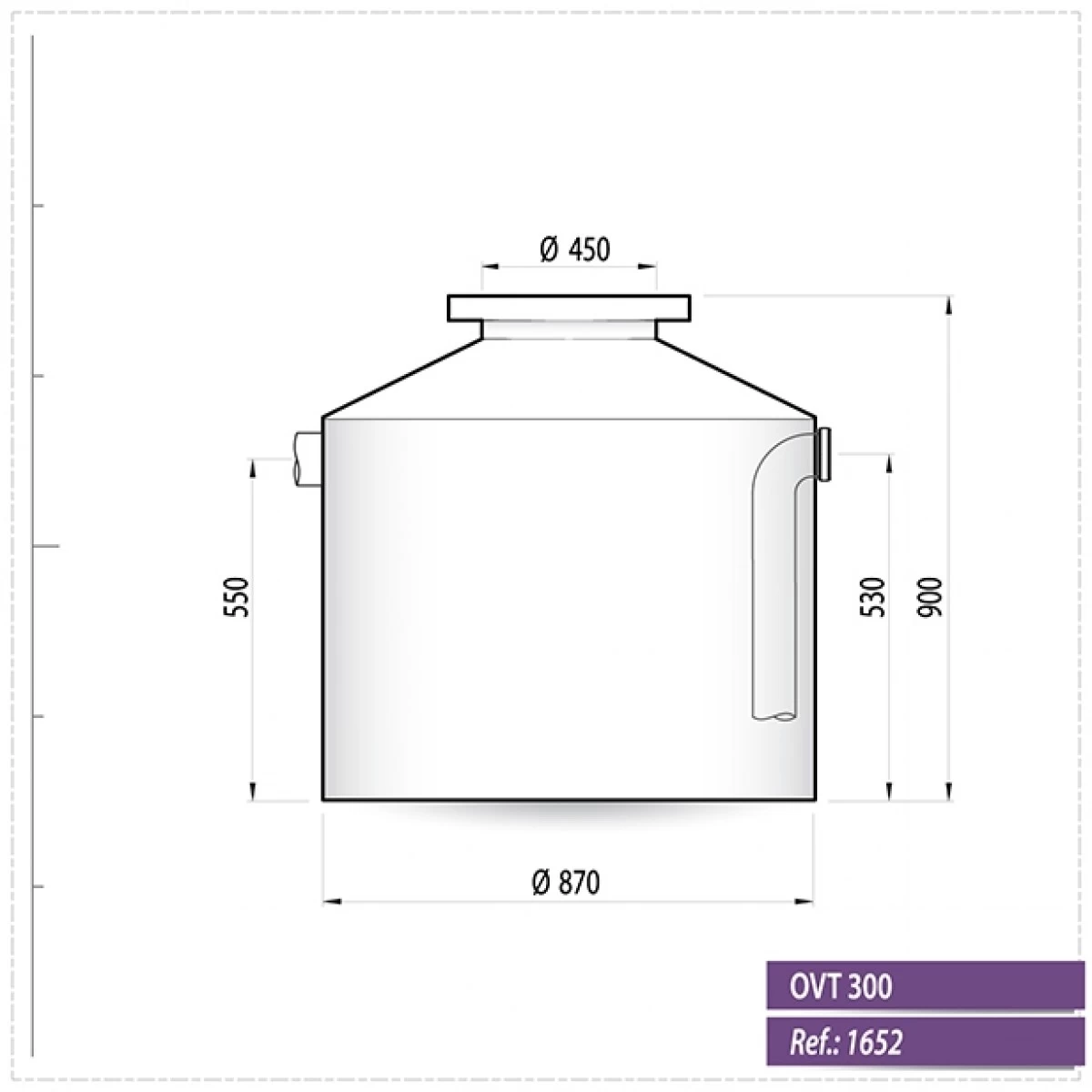 Een vet afscheider met een volume van 300 liter en aansluitingen 2x110mm. De scheiding verloopt door het verschil in densiteit.