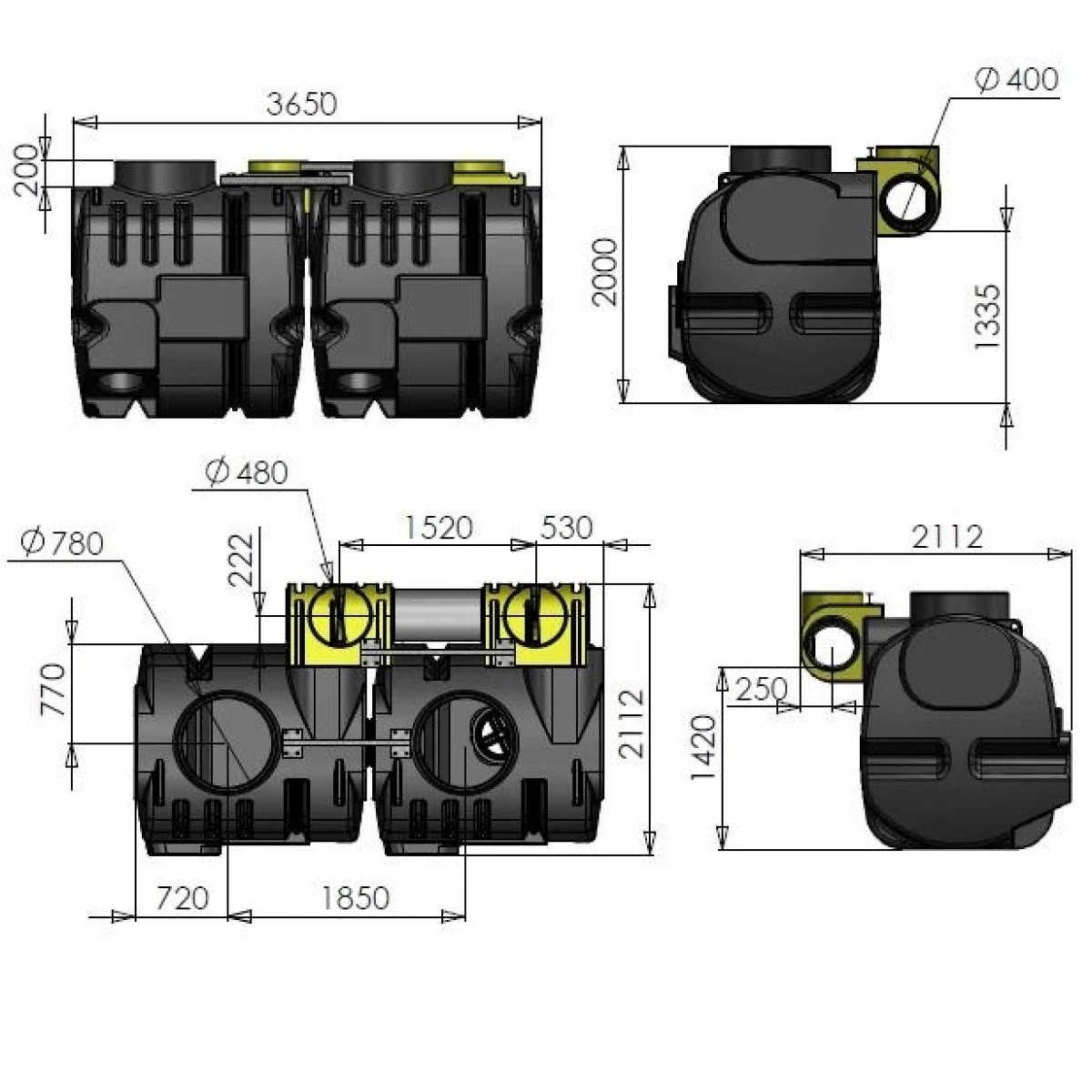 - Afmetingen: 3650 x 2112 x 2000 mm