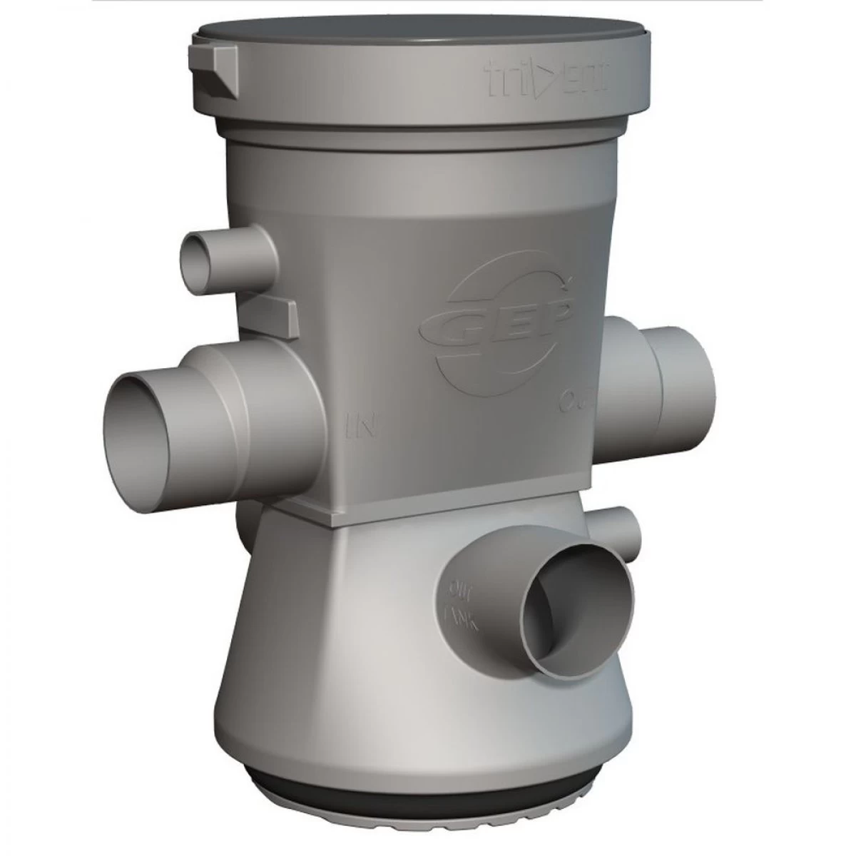GEP Trident 325 Regenwaterfilter is een zelfreinigende regenwaterfilter voor regenwatersystemen bij ondergrondse montage, geschikt tot 325 m² dakoppervlak, toegankelijk via mangat met deksel. De afvoer van schoon water is zowel links als rechts, zodat u zelf de keuze hebt bij de montage.