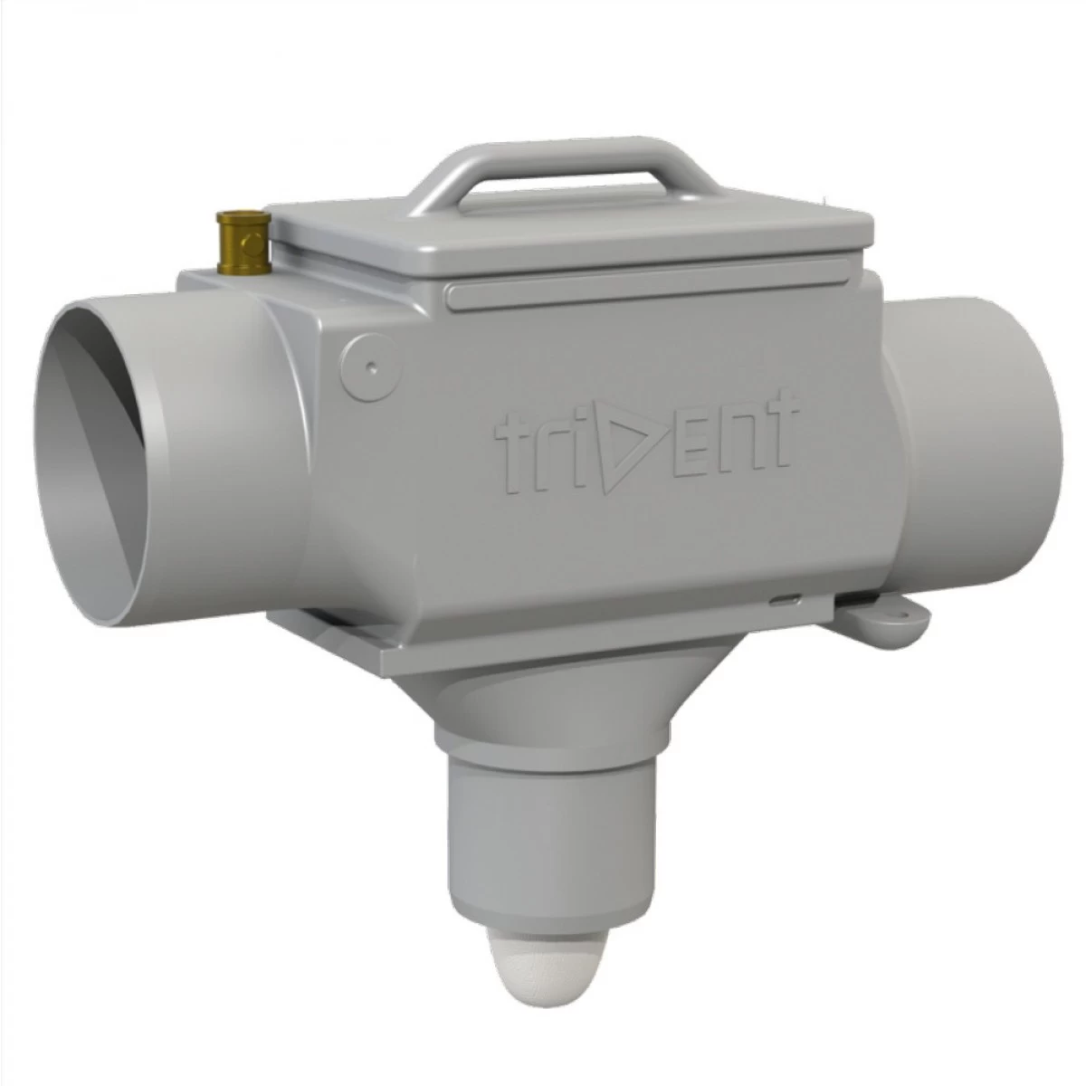 GEP Trident 450 tankfilter met skimmer-overloop is een regenwaterfilter, gemonteerd in een put of mangat. Vuil- en restwater worden horizontaal afgevoerd naar de overloop en het schone water stroomt onderuit de filter in de regenwatertank. Voor gebruik tot 450m² dakoppervlak
