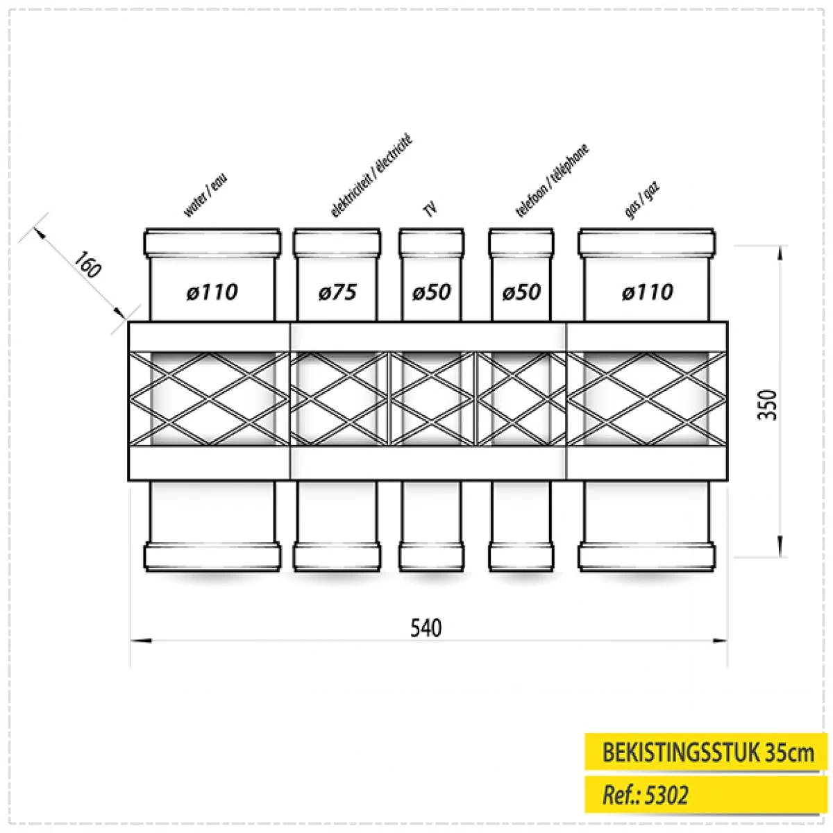 - Doorvoeren (van links naar rechts): Ø 110 voor water, Ø 75 voor elektriciteit, Ø 50 voor telefoon, Ø 50 voor televisie, Ø 110 voor gas