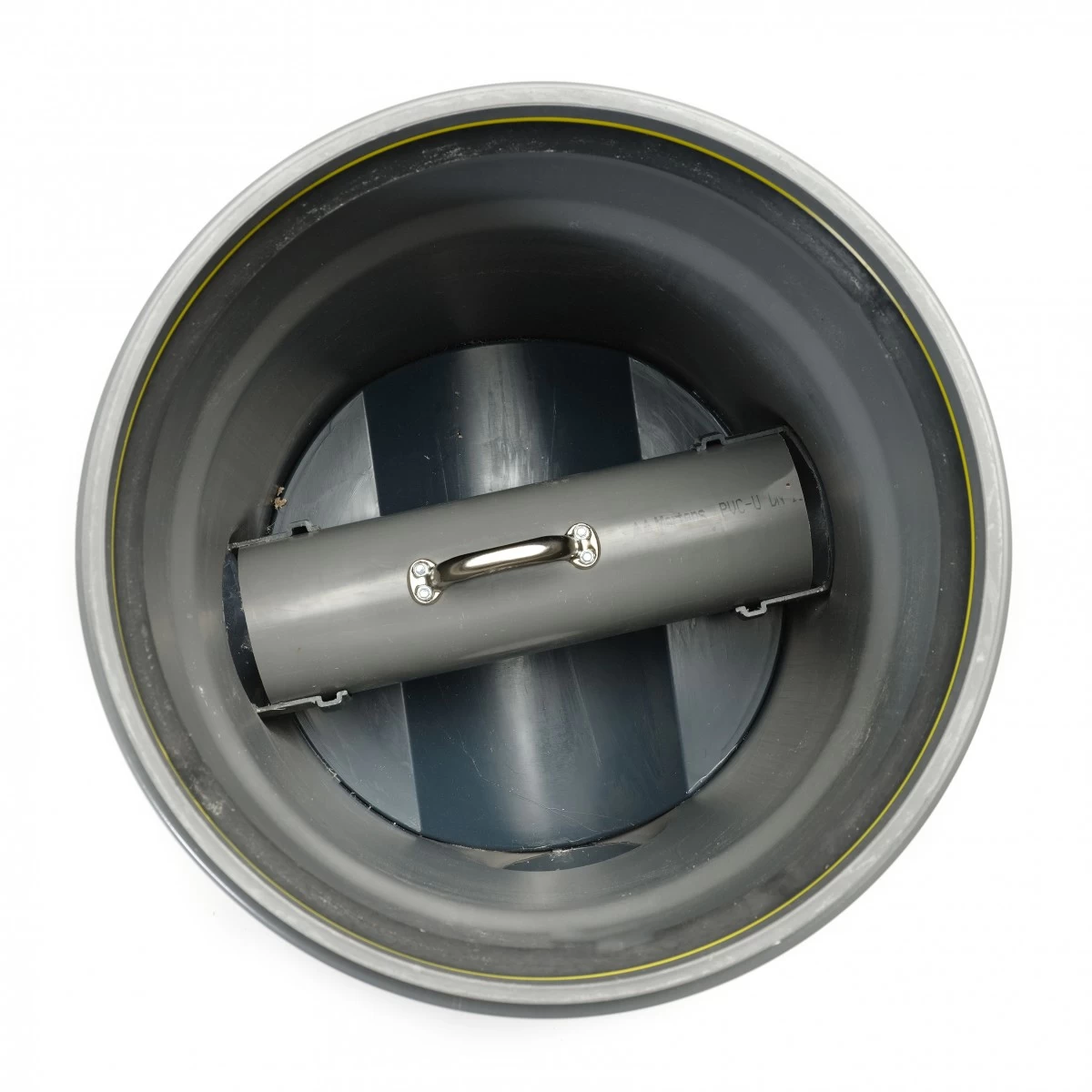 - Het regenwater komt in de filterput via de inloop en valt door de inox gaten van het filterpatroon.