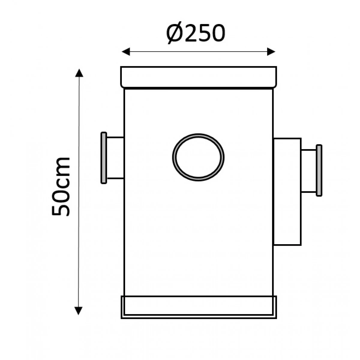 Een PVC sifonput met diameter 250 mm en 3 x Ø110 doorvoeren, 1 x Ø160 sifondoorvoer.