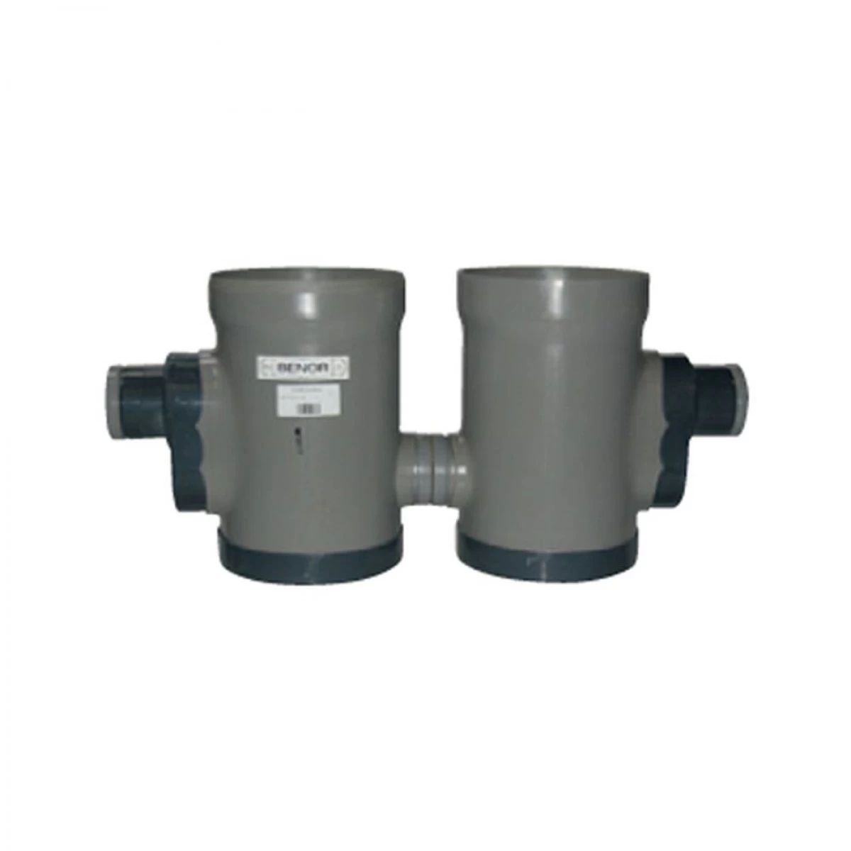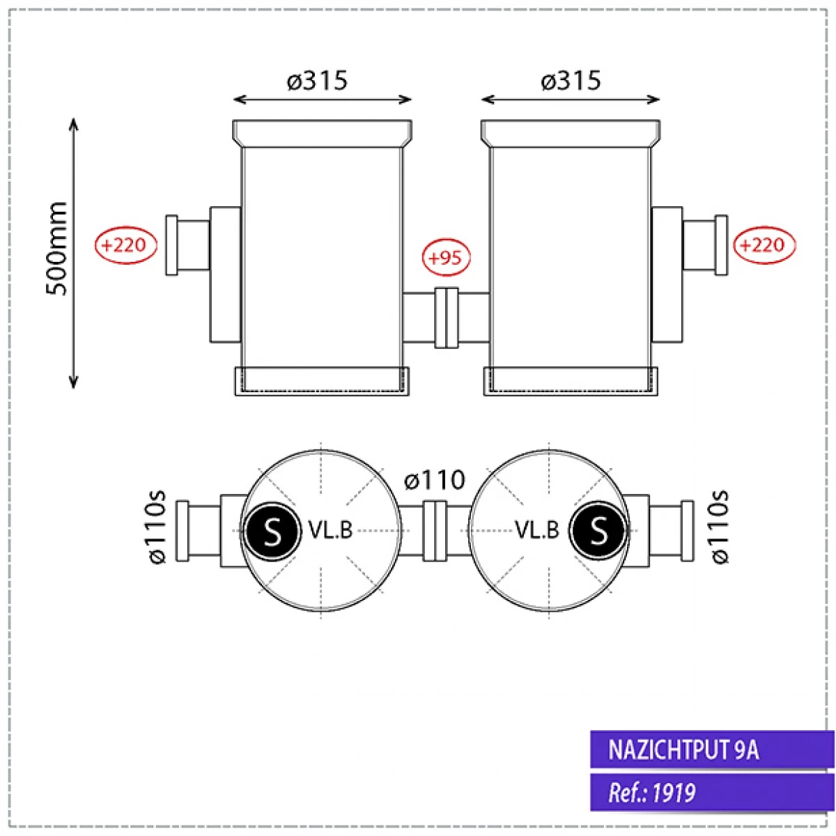 Een PVC vetvanger / dubbele sifonput type 9a met diameter 2x 315mm en aanslutingen 2×110/2×110 (sifon) doorvoeren.