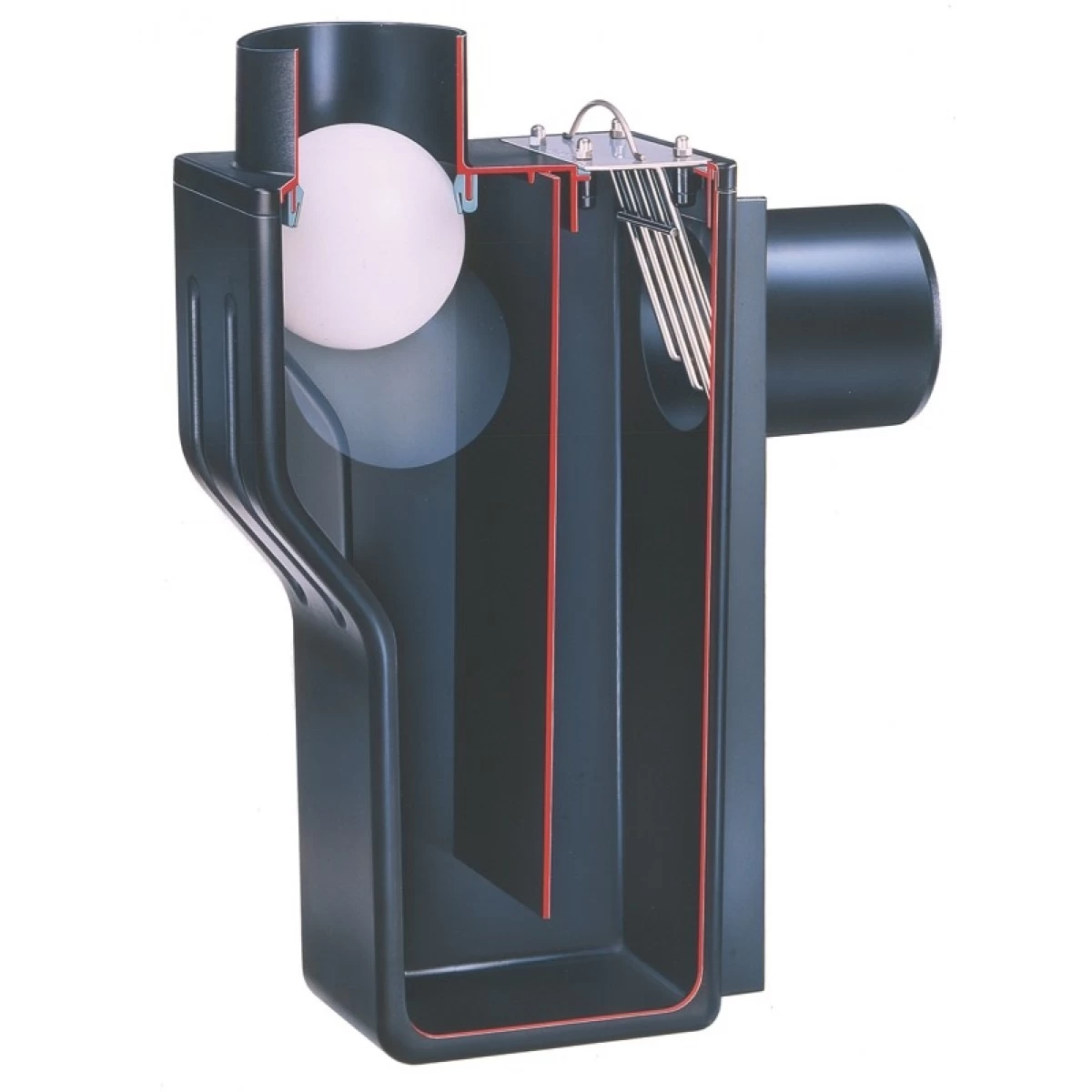 Een multifunctionele overloop voor binnen in de regenwatertank met een geurafsluiter, terugstroombeveiliging en ongediertebescherming.